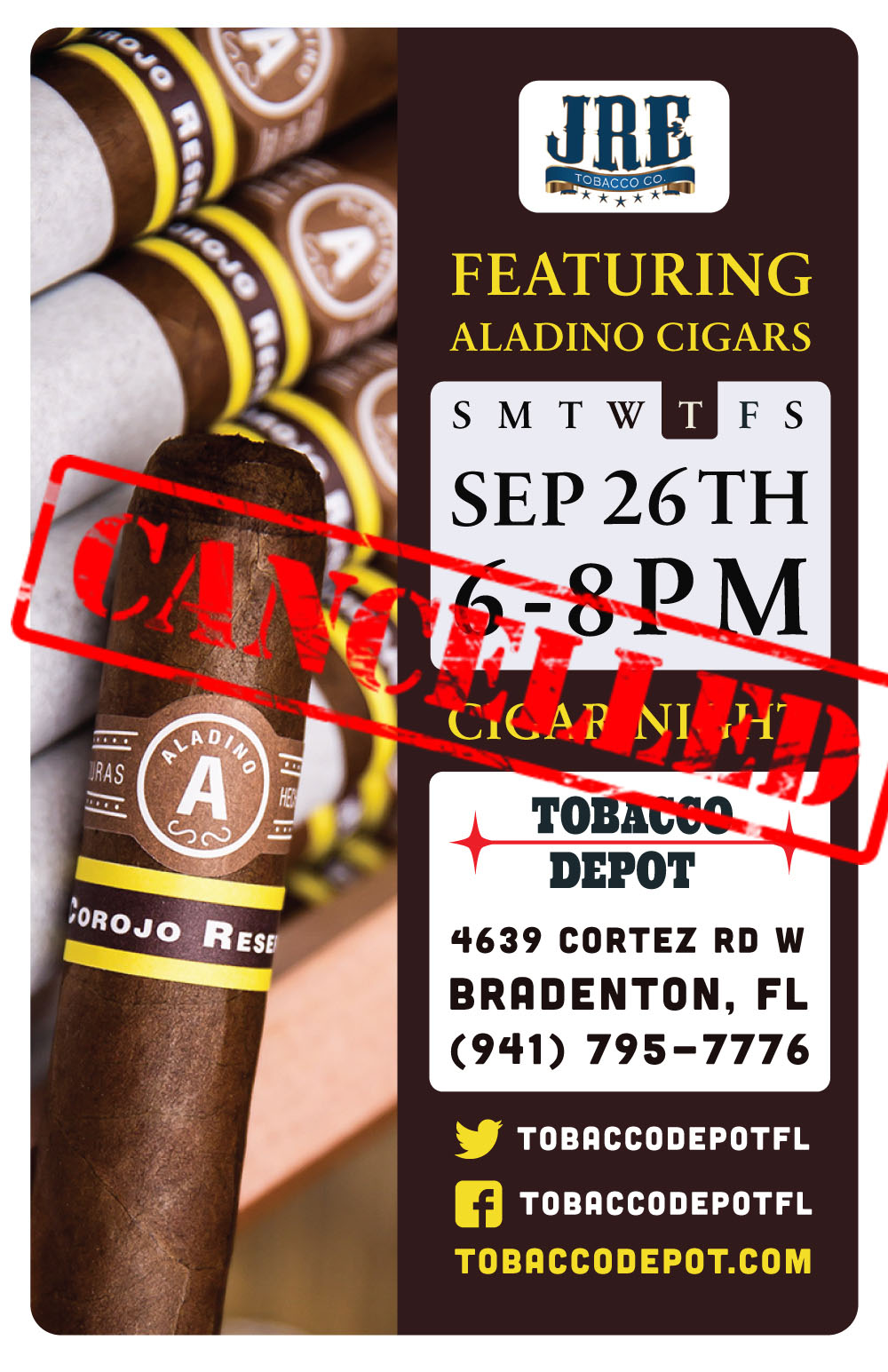 The Aladino Cigar Night on this Thursday 9/26 in Bradenton has been cancelled due to weather.
