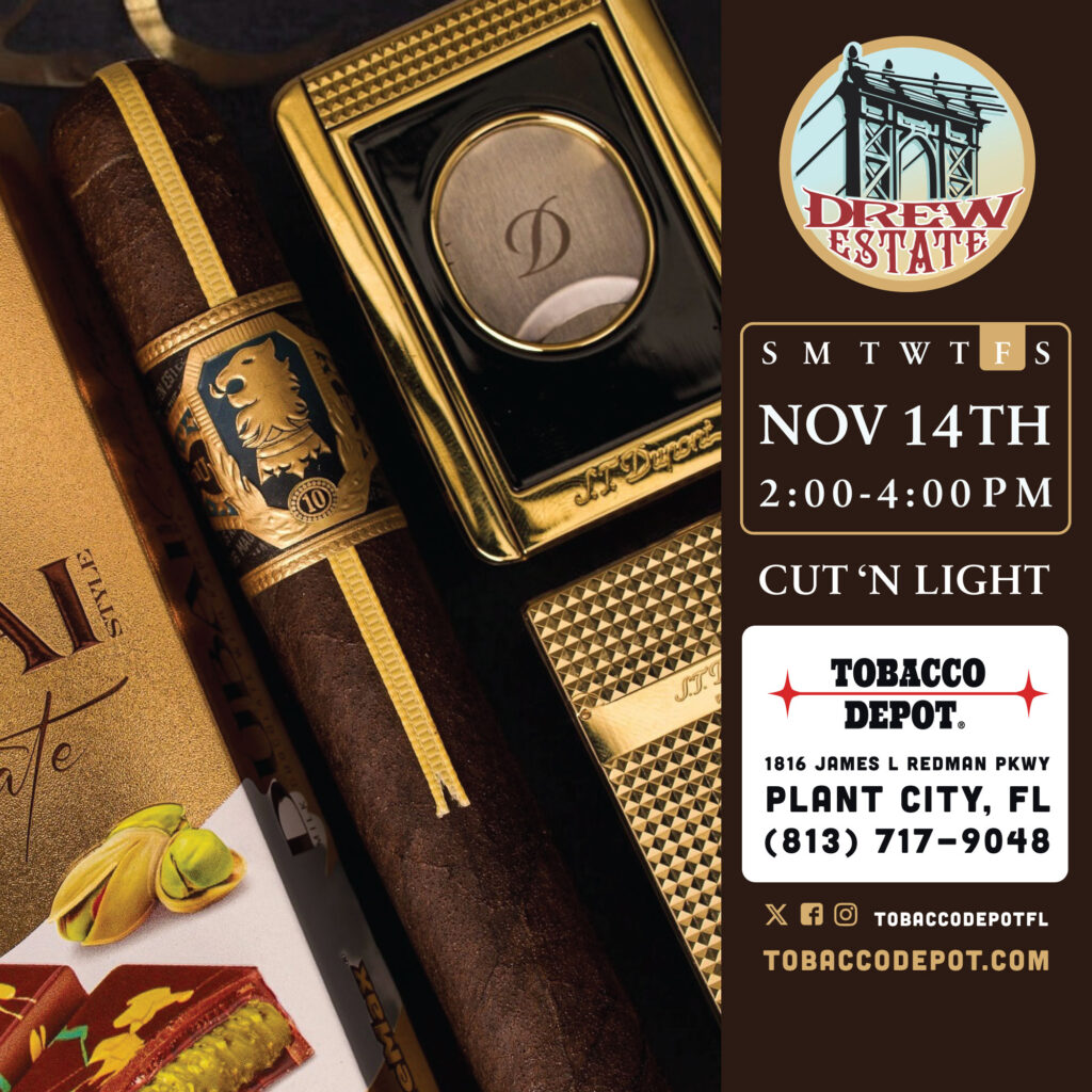 Join us at Tobacco Depot Plant City on Friday, November 14th, from 2–4 PM for an afternoon of exceptional cigars, bold flavors, and great company. Experience Drew Estate’s signature blends and connect with fellow cigar lovers — don’t miss it!