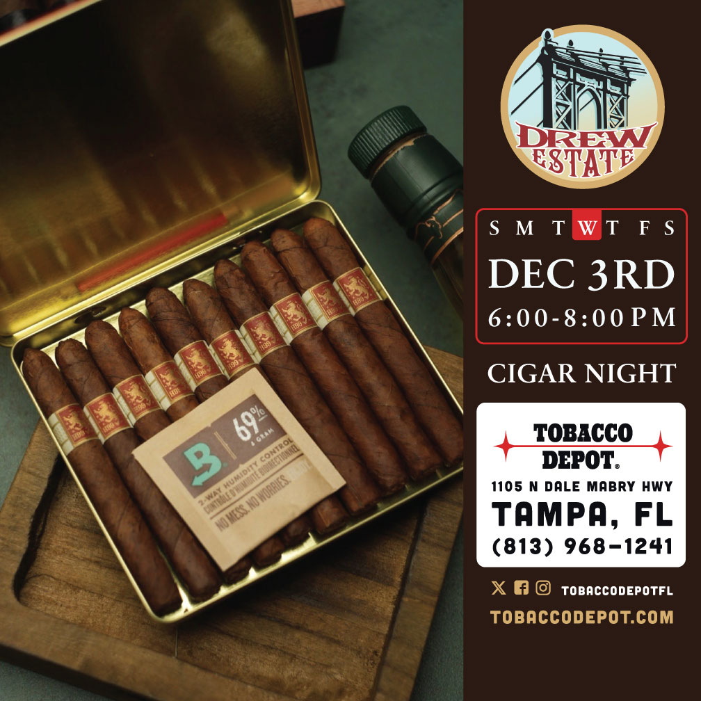 Join us at Tobacco Depot Tampa on Wednesday, December 3rd, from 6–8 PM for an evening of exceptional cigars, bold flavors, and great company. Experience Drew Estate’s signature blends and connect with fellow cigar lovers — don’t miss it!